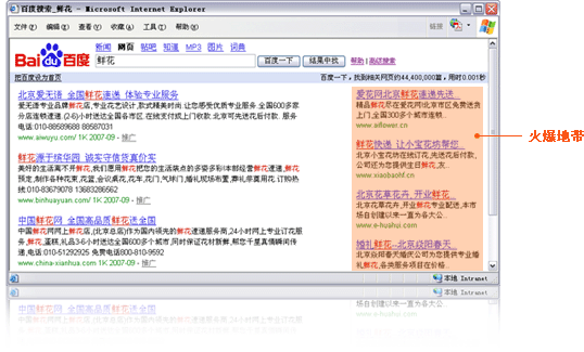 百度火爆地带出现在网页搜索结果第一页的右侧区域内,点击后可直接进入企业所指定的网站 |
